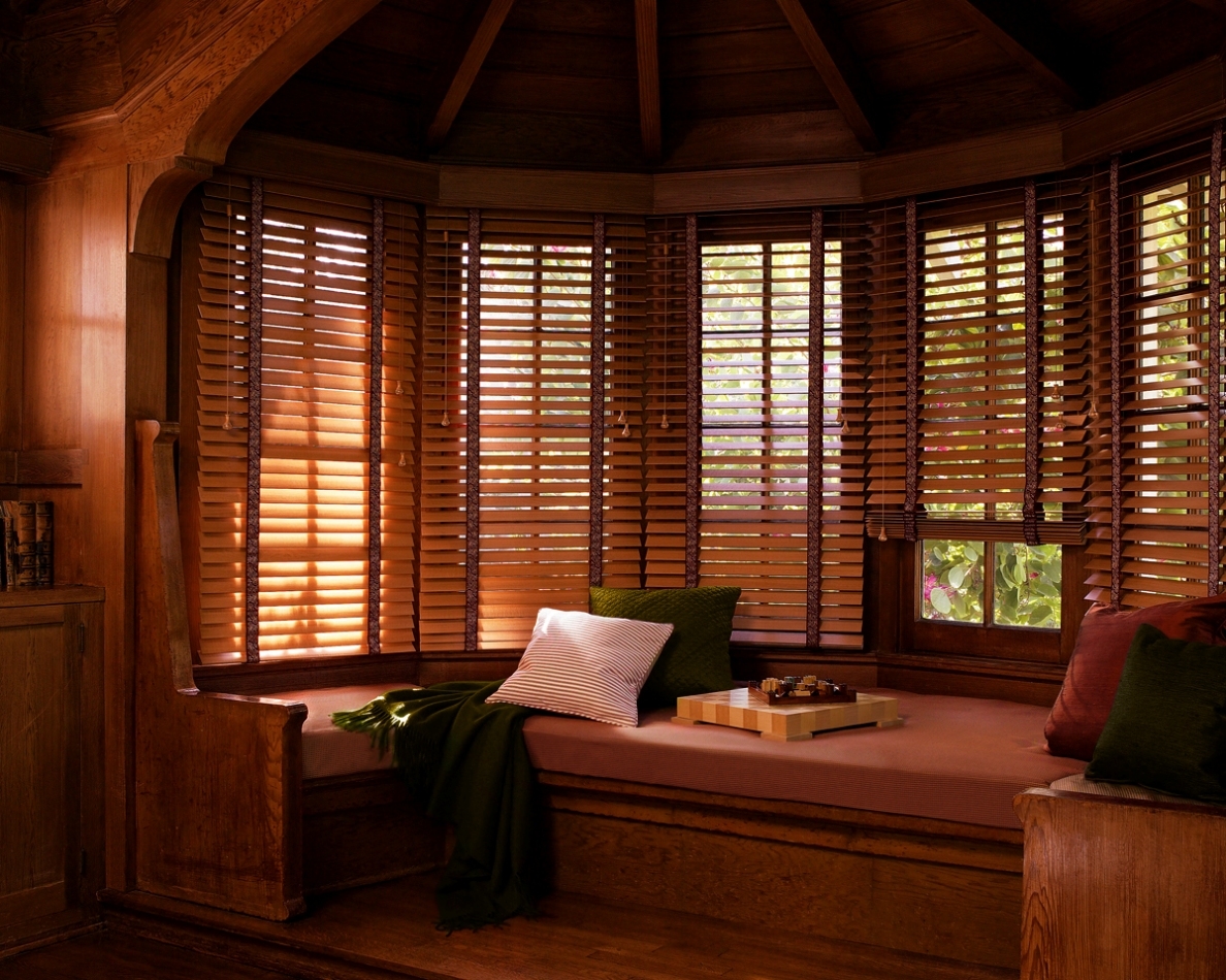 Ahşap, kahve tonlarında olan perdeler
